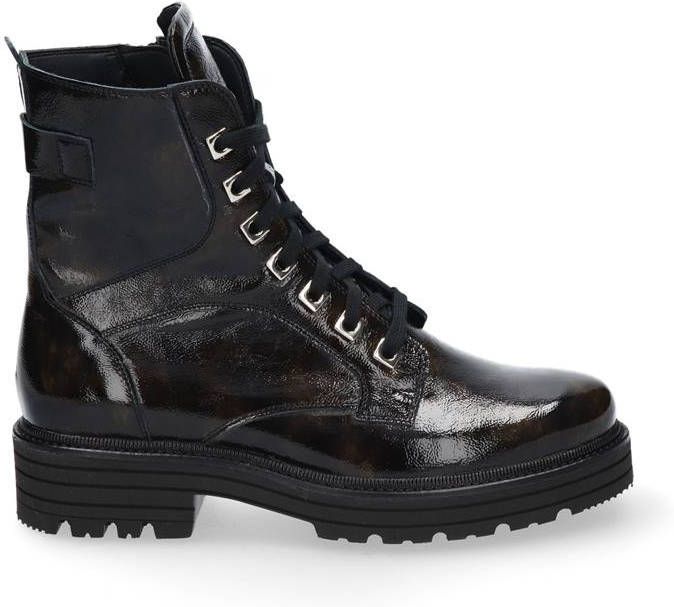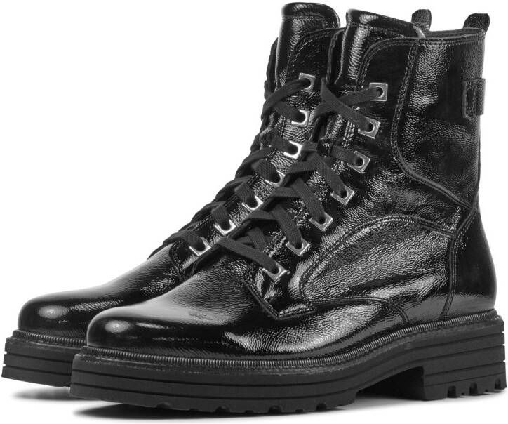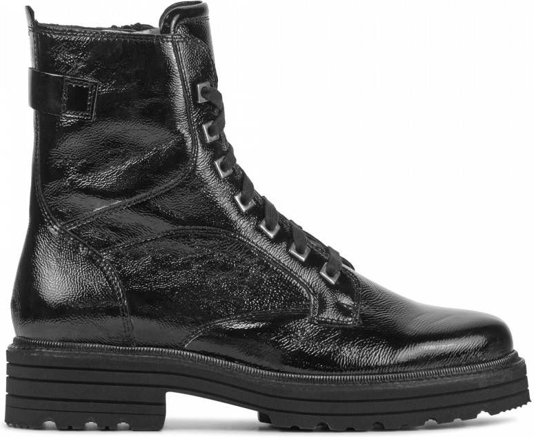 Damesschoen model 9758 755 in de kleur zwart van Durea Pasvorm Dit model van Durea valt normaal op maat Beschrijving Enkellaars met lak voor dames van het merk Durea. Deze leren veterlaars is uitgevoerd in zwart leer met laklook. De veters zijn door zilverkleurige ringen geregen. De binnenzijde van de schacht bevat een rits om het aan- en uittrekken te versoepelen. De binnenkant is uitgevoerd in leer en een stevig contrefort draagt bij aan het loopgemak. Het uitneembare voetbed is te vervangen door een persoonlijke inlegzool. De rubberen loopzool heeft een grof profiel voor stevige grip.